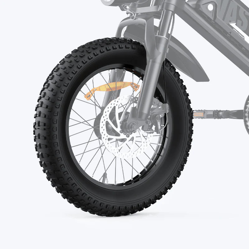 De A13 is uitgerust met 16-inch (40,6 cm) brede fat tires, ontworpen voor maximale grip en stabiliteit. Van besneeuwde heuvels tot zand- en gravelpaden: de extra brede banden absorberen schokken effectief en zorgen voor een soepele, gecontroleerde rijervaring op uiteenlopende ondergronden.